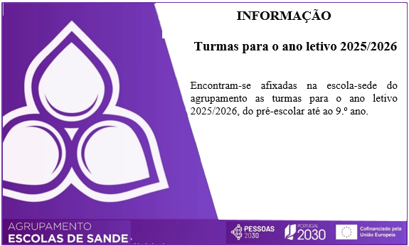 Encontram-se afixadas na escola-sede do agrupamento as turmas para o ano letivo 2025/2026, do pré-escolar até ao 9.º ano..
